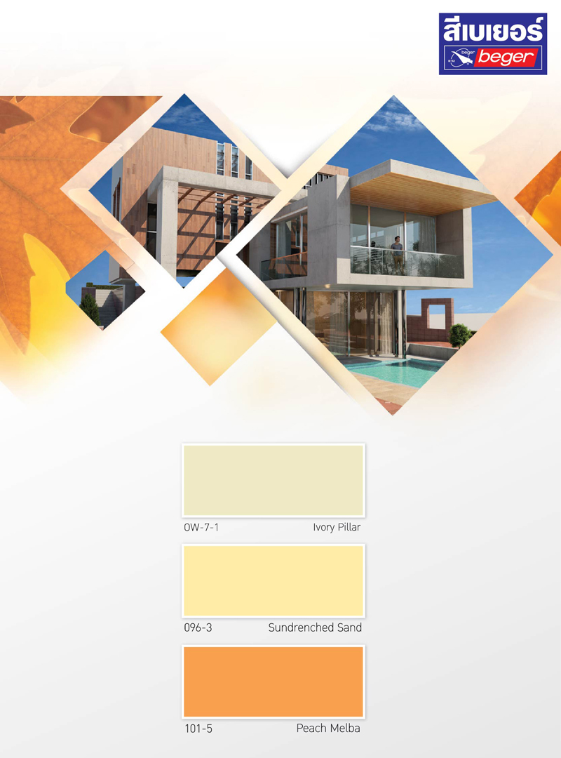 “สีบ้านเย็น ประหยัดค่าไฟ เช็ดล้างได้” สีทับหน้าสูตรน้ำ เกรด : Premium พื้นที่การทา : 30 – 40 ตารางเมตร สามารถผสมสีได้จากศูนย์ผสมสีเบเยอร์คัลเลอร์ดีไซน์